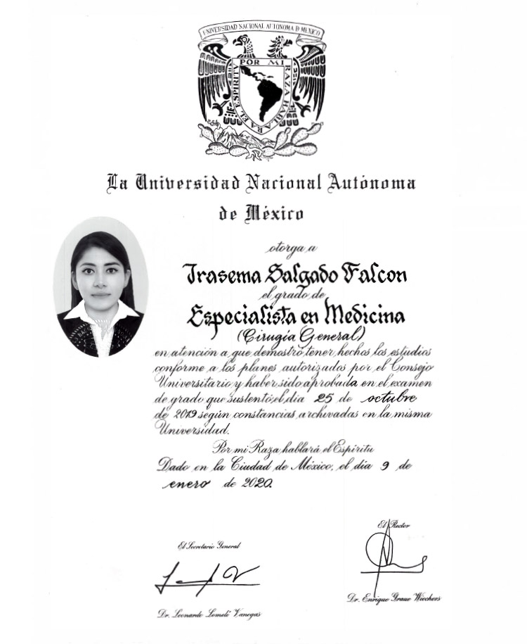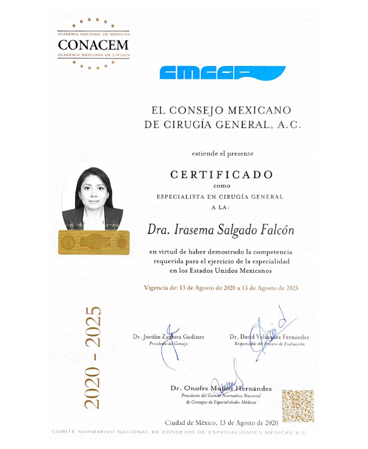 Cuento con la certificación del Consejo Mexicano de Cirugía General y soy Asociate Fellow of American College of Surgeons.